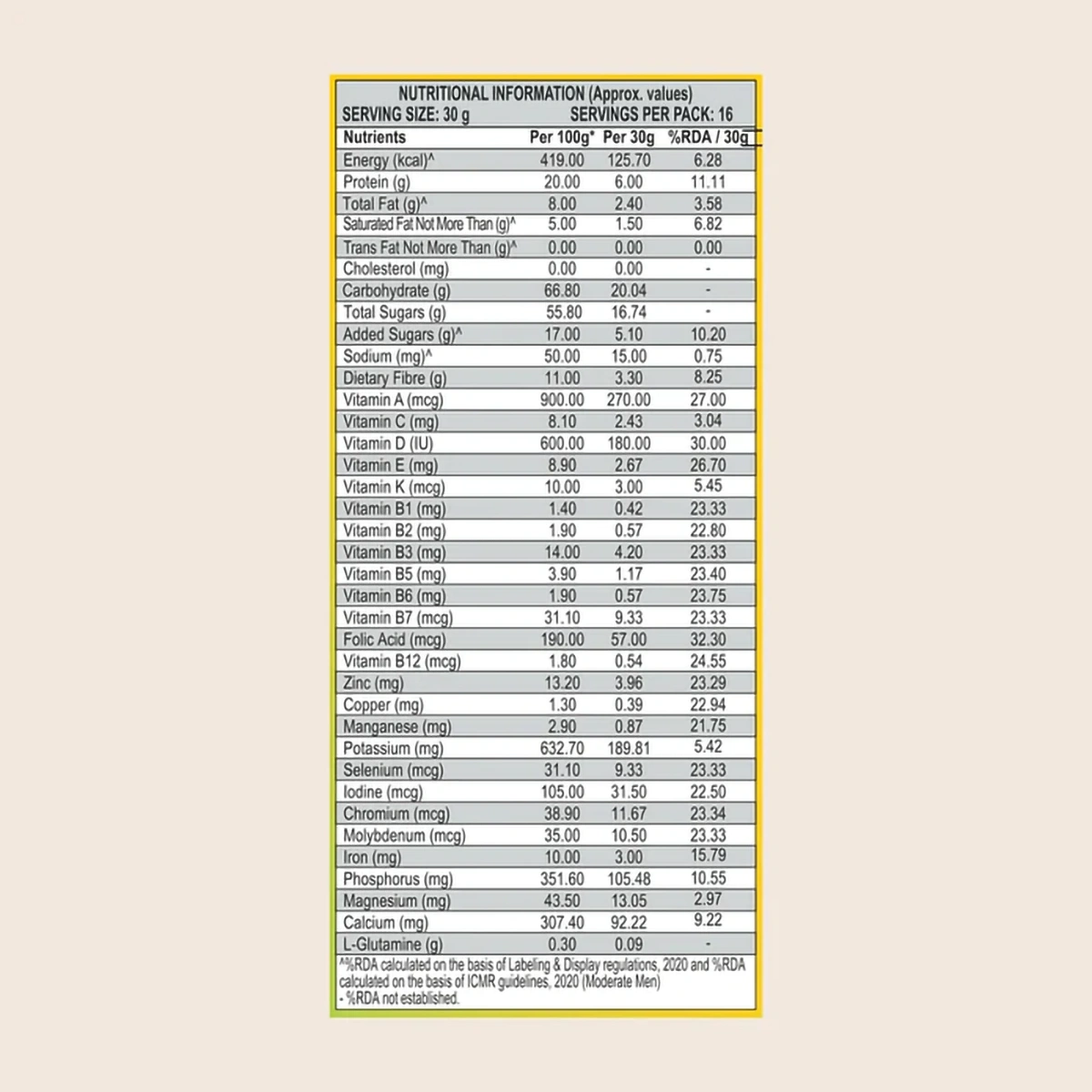 Key Ingredients -: Milk solids, Maltodextrin, Sugar, Proteins blend 12% (Soya protein isolate, Whey Protein Concentrate), Anticaking agent (INS 551), Nature identical flavouring substance, Edible caseinates, Minerals (Phospho rus, Potassium, Zinc, Tricalcium Phosphate, Magnesium, Ferrous fumarate, Manganese, Copper, lodine, Selenium, Molybdenum, Chromium), L-Glutamine 0.3%, Botanical extracts (Carotenoids, Rosehips, Spinach (Spinacia oleracea), Patal Kohda (Pueraria tuberosa), Meda (Polygonatum cirrhifolium), Shatawar (Asparagus racemosus), Kakoli (Roscoea procera), Ridhi (Habenaria intermedia), Varahikand (Dioscorea bulbifera), Barnyara (Sida cordifolia), Musali (Chlorophytum borivilianum), Concha (Mucuna pruriens), Ashwagandha (Withania somnifera), Soy, Shiitake mushoom, v Com), Dates (Phoenix dactilifera) Powder Khandisar sugar Ermulier IIS Sve 415), Vitamins (Vitamin B1, Vitamin B2, Vitamin B3, Vitamin B5, Vitamin B6, V Vitamin B7, Vitamin B9 and Vitamin B12, Vitamin K2 (MK-7).